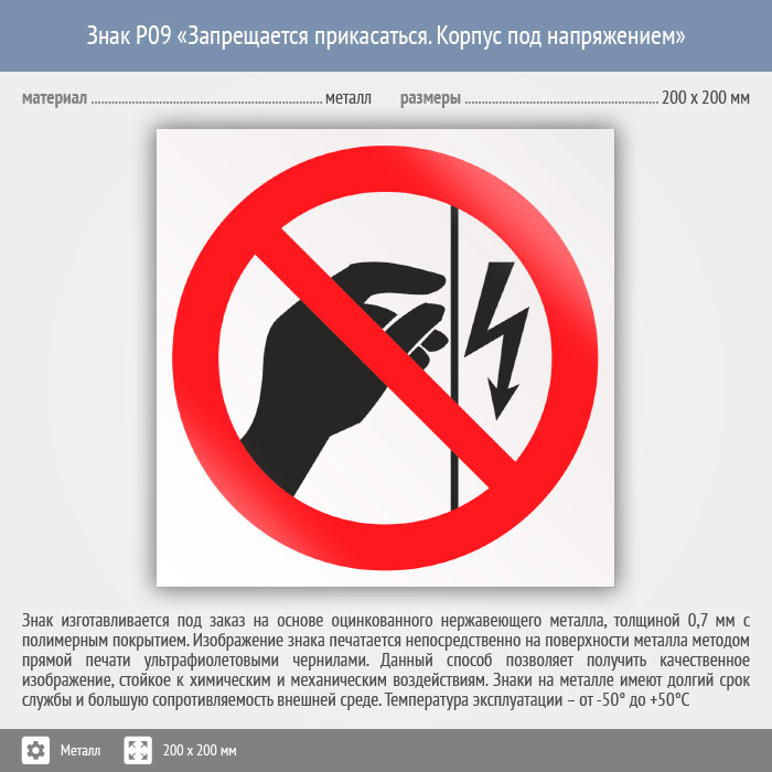 Знак P09 «Запрещается прикасаться. Корпус под напряжением» (металл, 200х200 мм) в Кашире купить