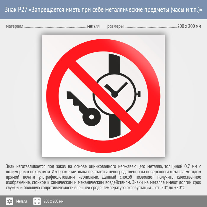 Знак P27 «Запрещается иметь при (на) себе металлические предметы (часы и т.п.)» (металл, 200х200 мм) в Кашире купить