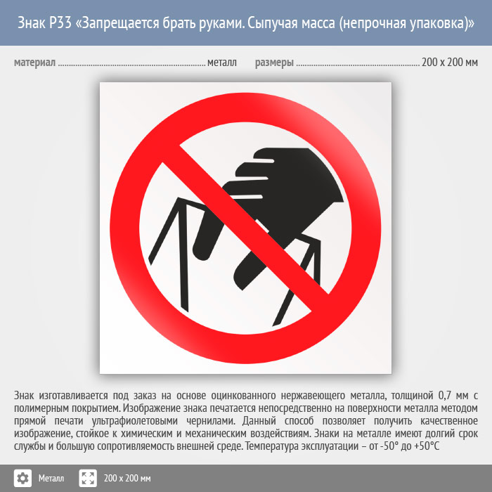 Знак P33 «Запрещается брать руками. Сыпучая масса (непрочная упаковка)» (металл, 200х200 мм) в Кашире купить