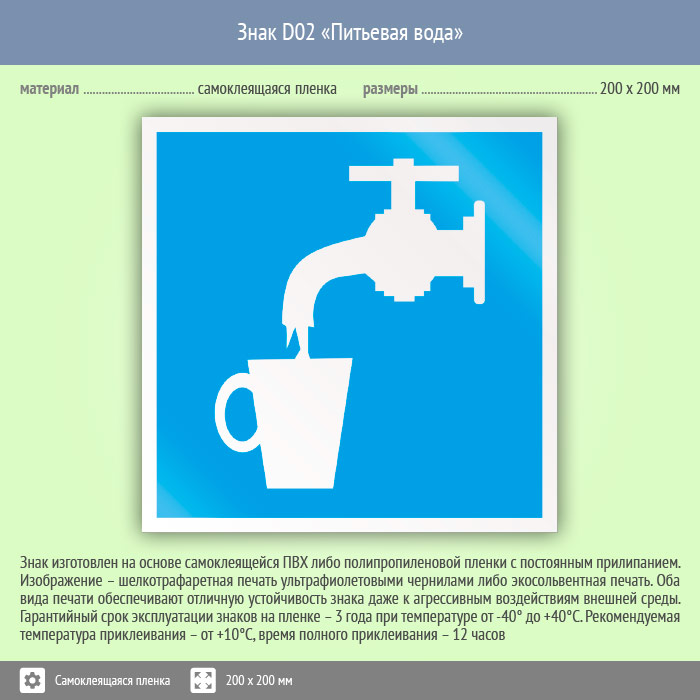 Знак «Питьевая вода» указывает, что данную воду можно пить. Код знака: D02