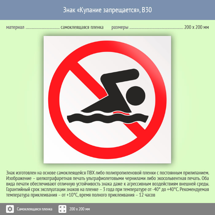 Знак «Купание запрещено» может быть изготовлен любого размера на самоклеящейся пленке, пластике толщиной 0.5, 2 или 4 мм и металле. Также возможно применение фотолюминесцентных и световозвращающих материалов