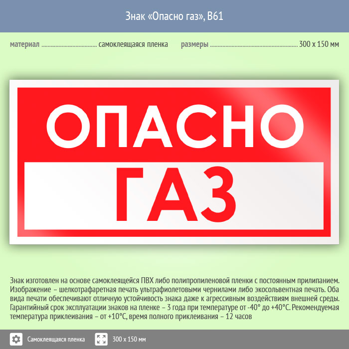 Знак «Опасно газ» может быть изготовлен любого размера на самоклеящейся пленке, пластике толщиной 0.5, 2 или 4 мм и металле. Также возможно применение фотолюминесцентных и световозвращающих материалов