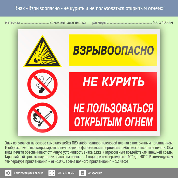 Знак «Взрывоопасно – не курить и не пользоваться открытым огнем» может быть изготовлен любого размера на самоклеящейся пленке, пластике толщиной 0.5, 2 или 4 мм и металле. Также возможно применение фотолюминесцентных и световозвращающих материалов
