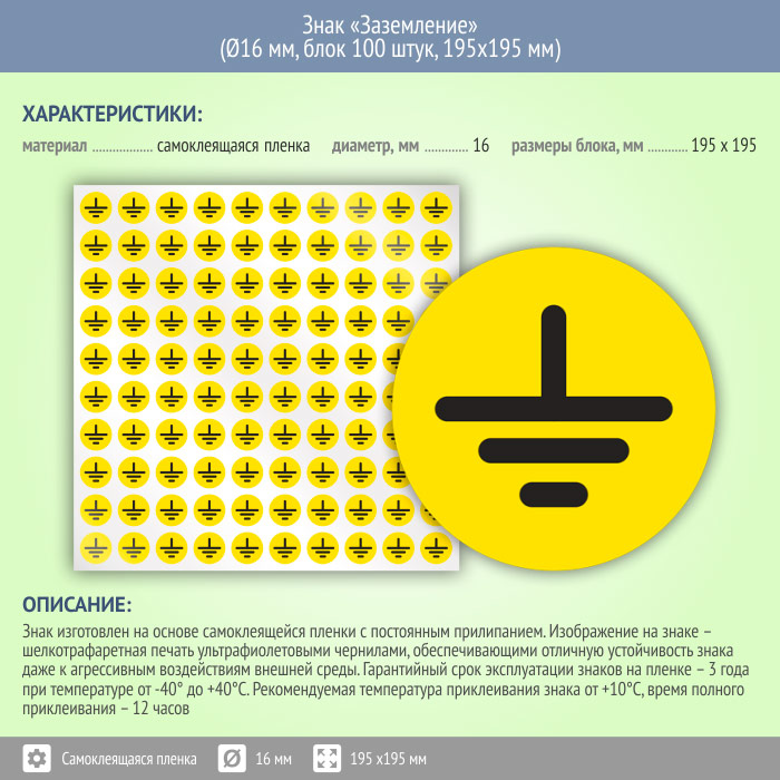 Знак (плакат) «Заземление», S46 (пленка, диаметр 16 мм, блок 100 штук, 195х195 мм) в Кашире купить