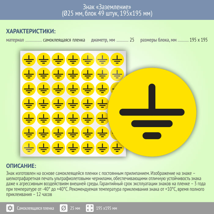Знак (плакат) «Заземление», S46 (пленка, диаметр 25 мм, блок 49 штук, 195х195 мм) в Кашире купить
