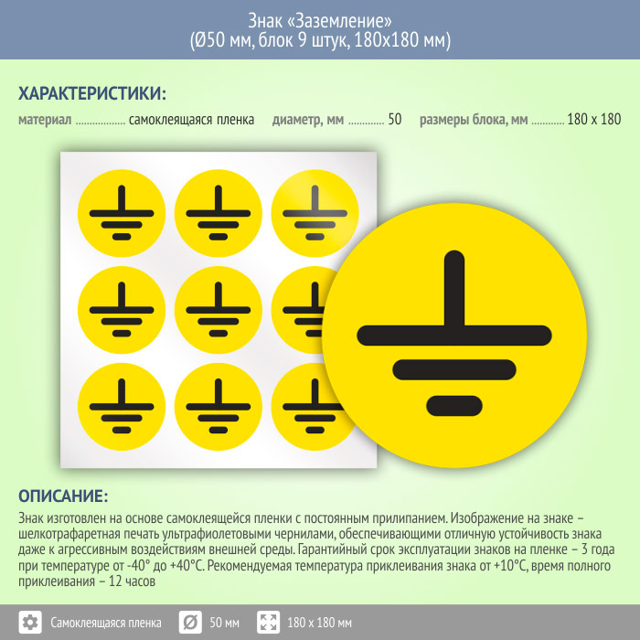 Знак (плакат) «Заземление», S46 (пленка, диаметр 50 мм, блок 9 штук, 180х180 мм) в Кашире купить