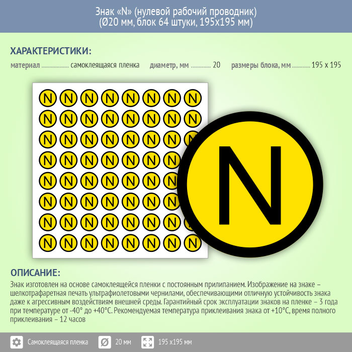 Знак (плакат) «N» (нулевой рабочий проводник), S47 (пленка, диаметр 20 мм, блок 64 штуки, 195х195 мм) в Кашире купить