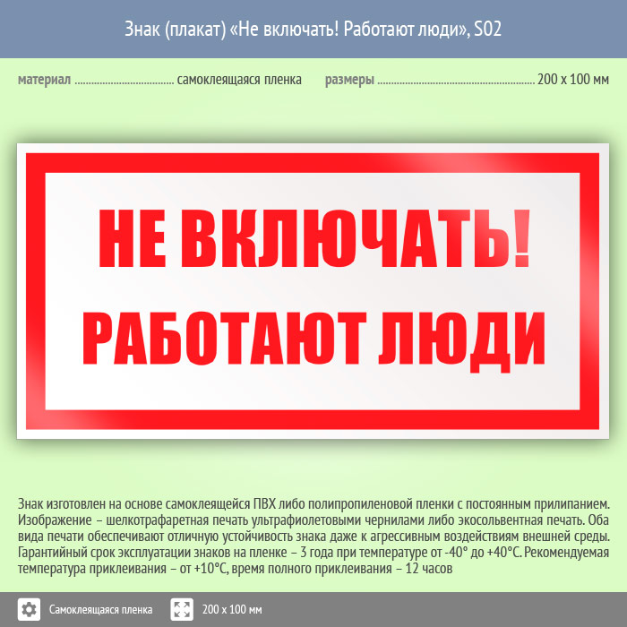 Знак (плакат) «Не включать! Работают люди», S02 (пленка, 200х100 мм) в Кашире купить