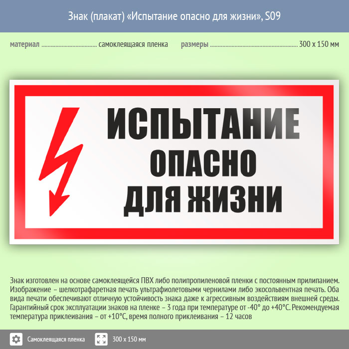Знак (плакат) «Испытание опасно для жизни», S09 (пленка, 300х150 мм) в Кашире купить