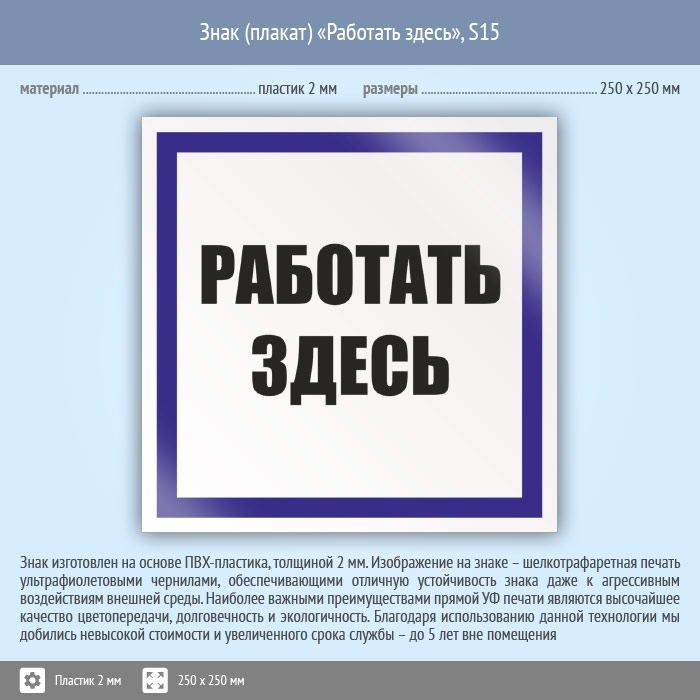 Знак (плакат) «Работать здесь», S15 (пластик, 250х250 мм) в Кашире купить