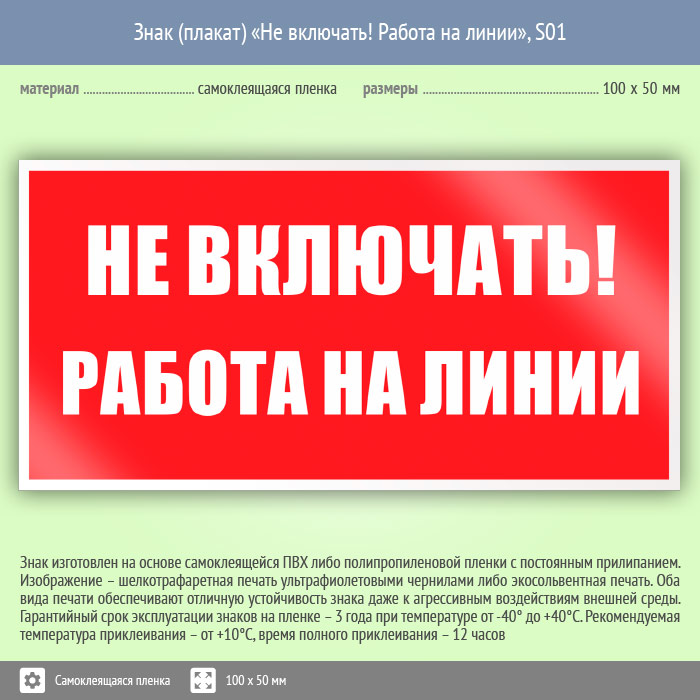 Знак (плакат) «Не включать! Работа на линии», S01 (пленка, 100х50 мм) в Кашире купить