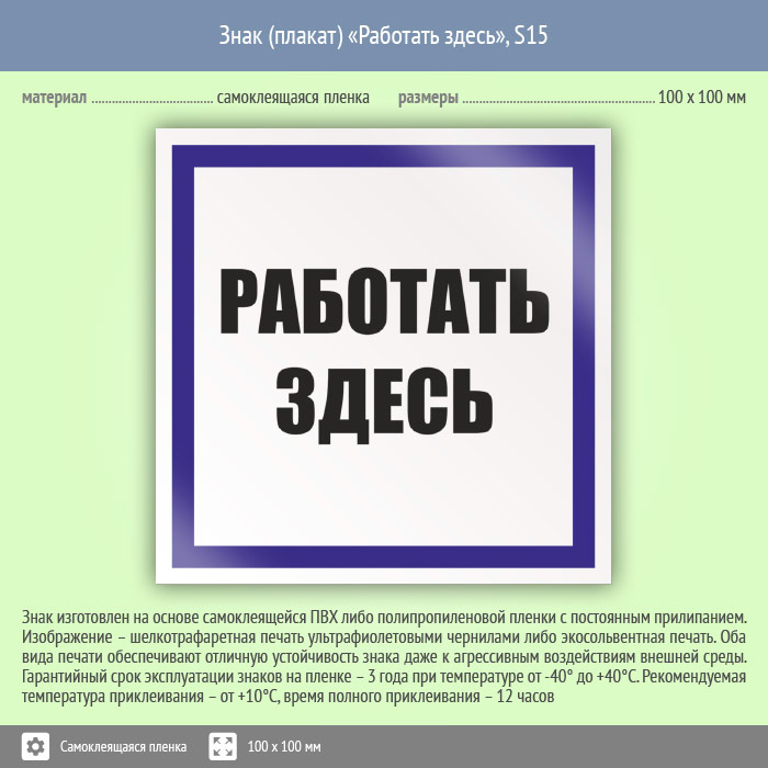 Знак (плакат) «Работать здесь», S15 (пленка, 100х100 мм) в Кашире купить