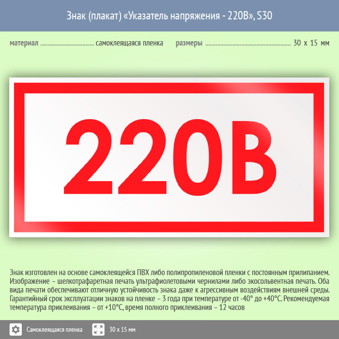 Знак (плакат) «Указатель напряжения - 220В», S30 (50 штук, пленка, 30х15 мм) в Кашире купить