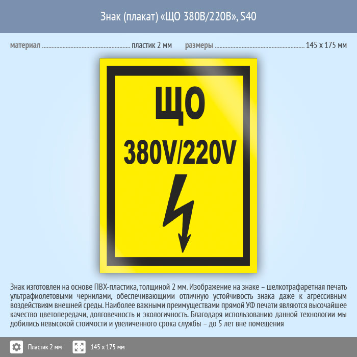 Знак (плакат) «ЩО 380В/220В», S40 (пластик, 145х175 мм) в Кашире купить