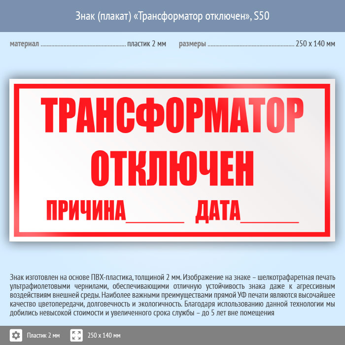 Знак (плакат) «Трансформатор отключен», S50 (пластик, 250х140 мм) в Кашире купить