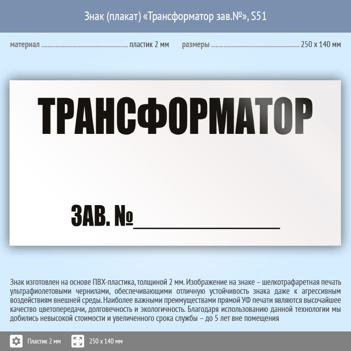 Знак (плакат) «Трансформатор зав.№», S51 (пластик, 250х140 мм) в Кашире купить
