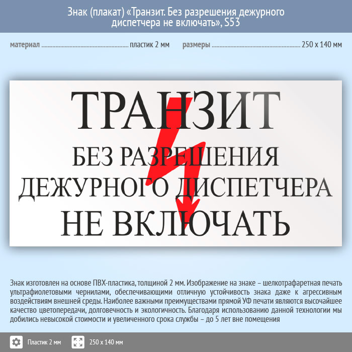 Знак (плакат) «Транзит. Без разрешения дежурного диспетчера Не включать», S53 (пластик, 250х140 мм) в Кашире купить