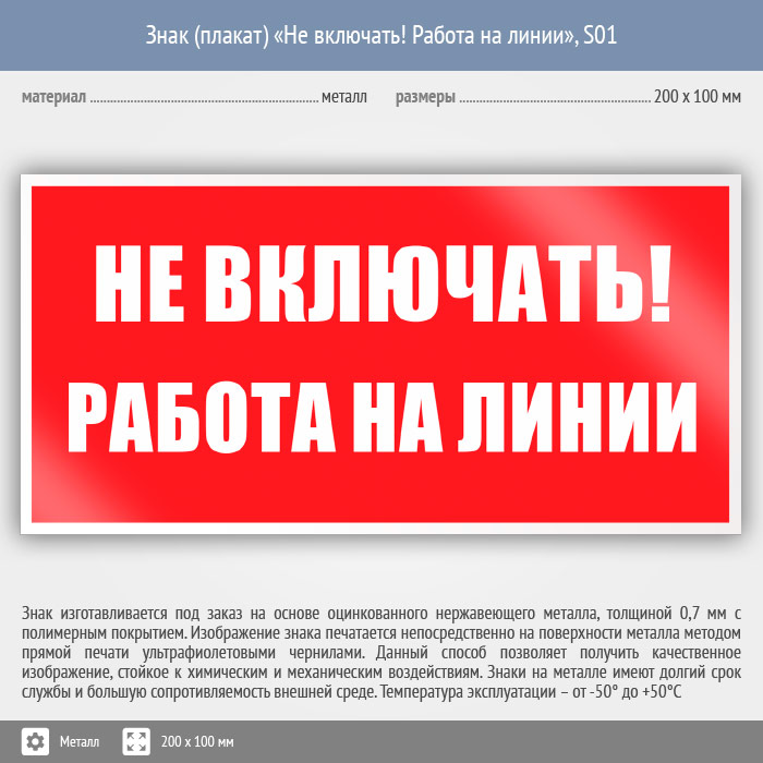 Знак (плакат) «Не включать! Работа на линии», S01 (металл, 200х100 мм) в Кашире купить