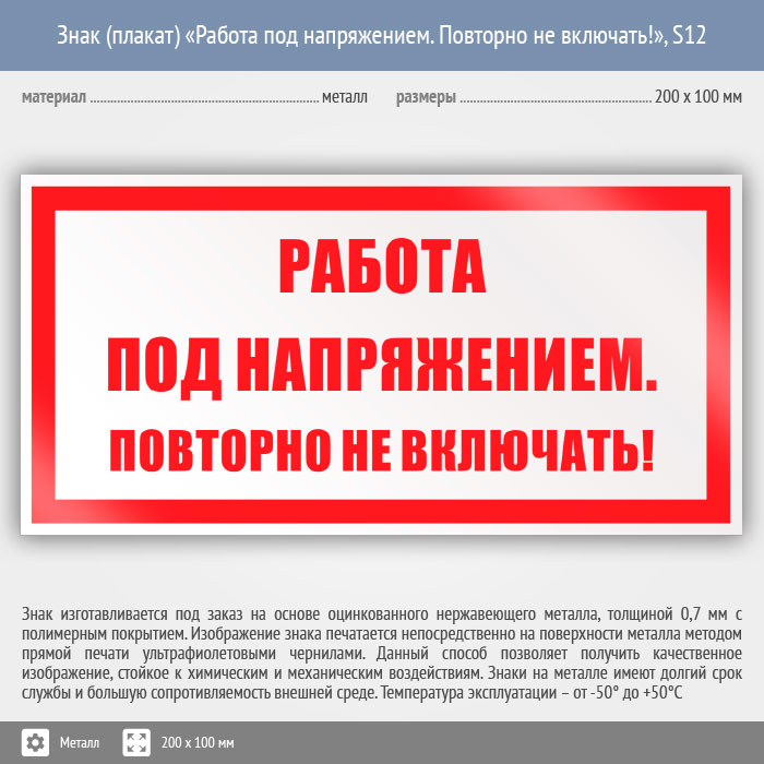 Знак (плакат) «Работа под напряжением. Повторно не включать!», S12 (металл, 200х100 мм) в Кашире купить