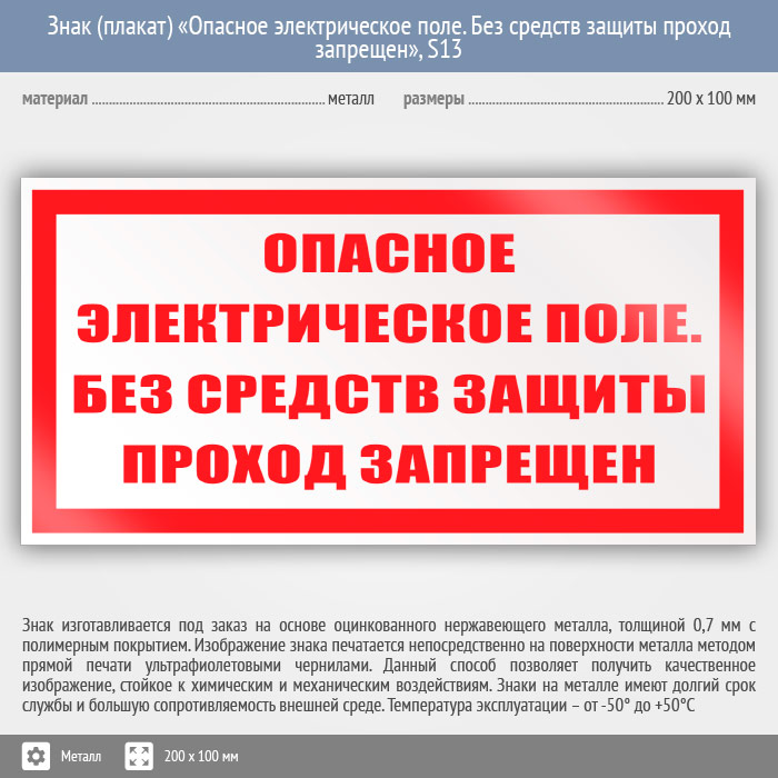 Знак (плакат) «Опасное электрическое поле. Без средств защиты проход запрещен», S13 (металл, 200х100 мм) в Кашире купить
