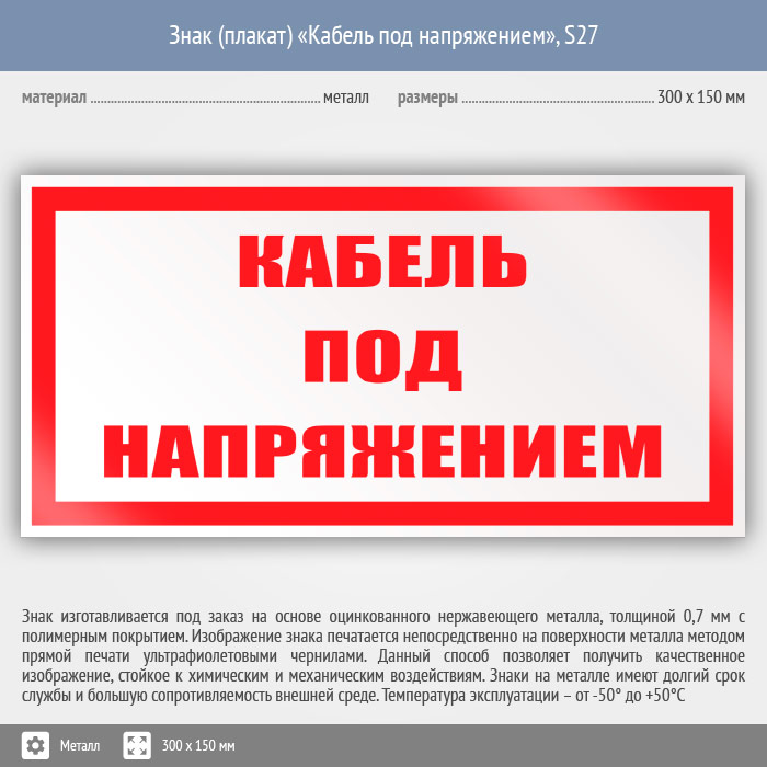 Знак (плакат) «Кабель под напряжением», S27 (металл, 300х150 мм) в Кашире купить