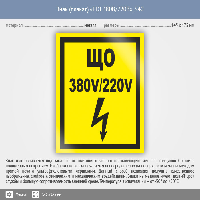 Знак (плакат) «ЩО 380В/220В», S40 (металл, 145х175 мм) в Кашире купить