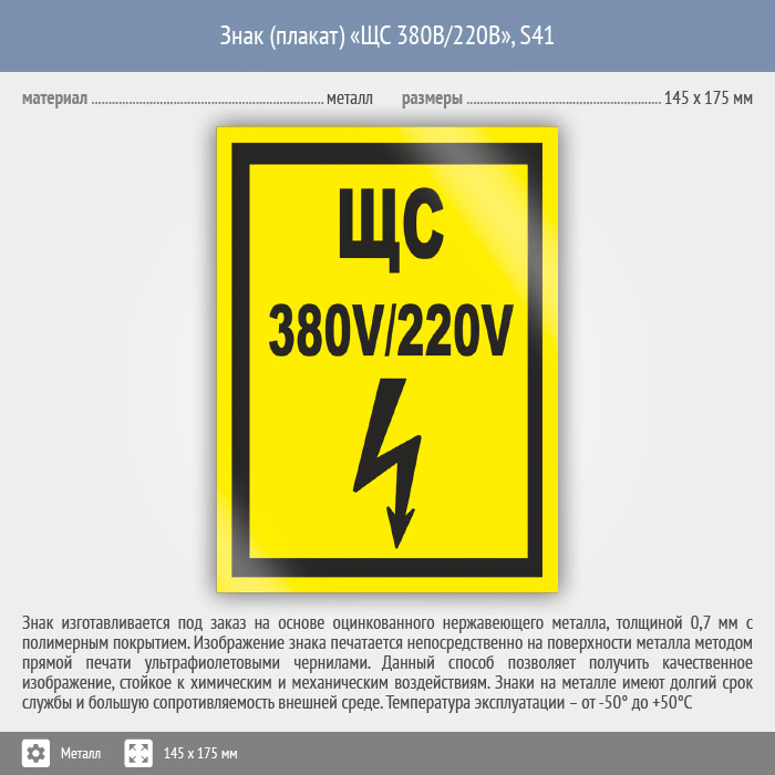 Знак (плакат) «ЩС 380В/220В», S41 (металл, 145х175 мм) в Кашире купить