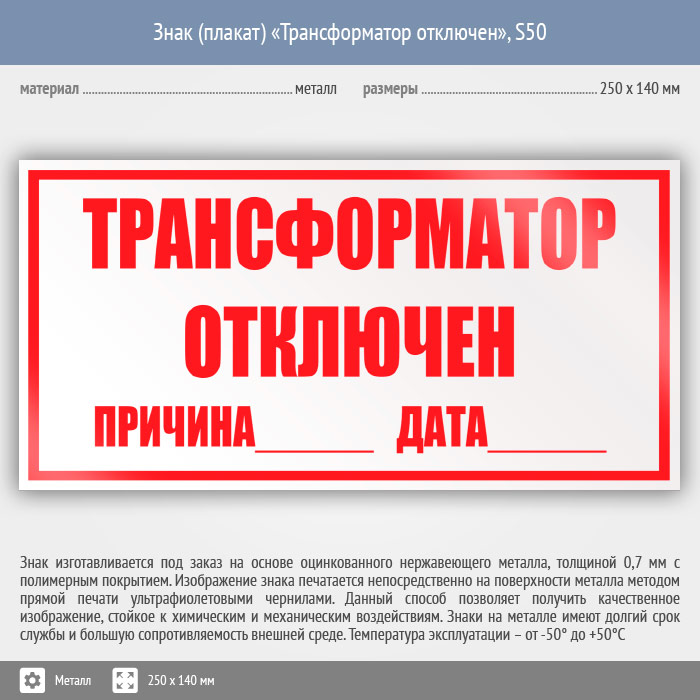 Знак (плакат) «Трансформатор отключен», S50 (металл, 250х140 мм) в Кашире купить