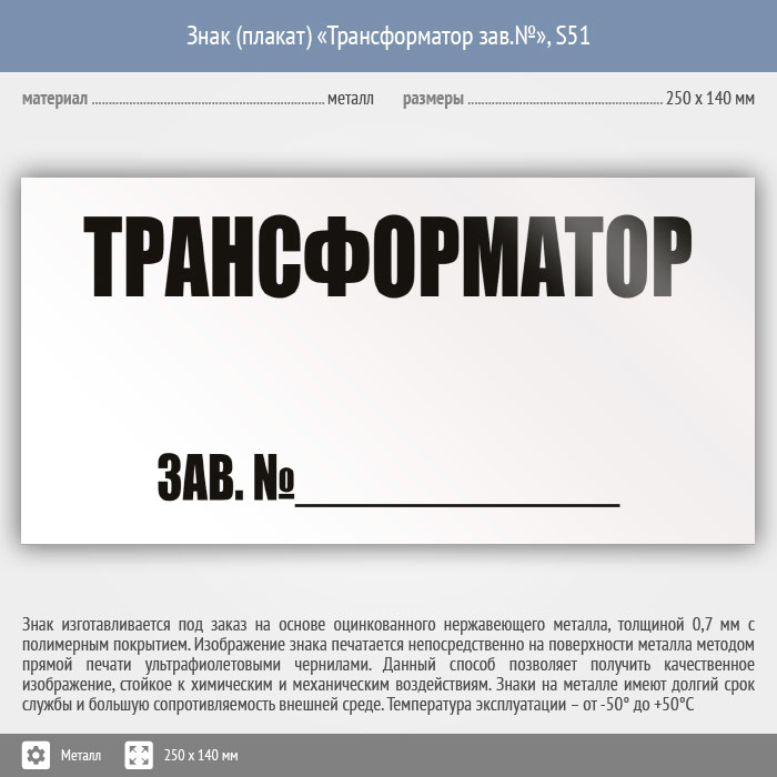 Знак (плакат) «Трансформатор зав.№», S51 (металл, 250х140 мм) в Кашире купить