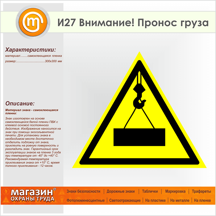 Знак «Внимание! Пронос груза», И27 (пленка, сторона 300 мм) в Кашире купить