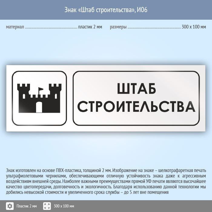 Знак «Штаб строительства», И06 (пластик, 300х100 мм) в Кашире купить