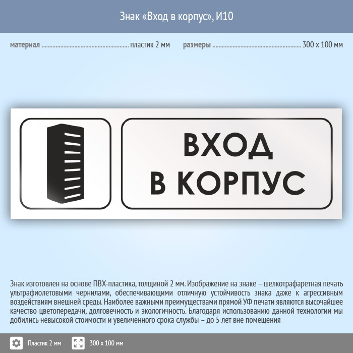 Знак «Вход в корпус», И10 (пластик, 300х100 мм) в Кашире купить