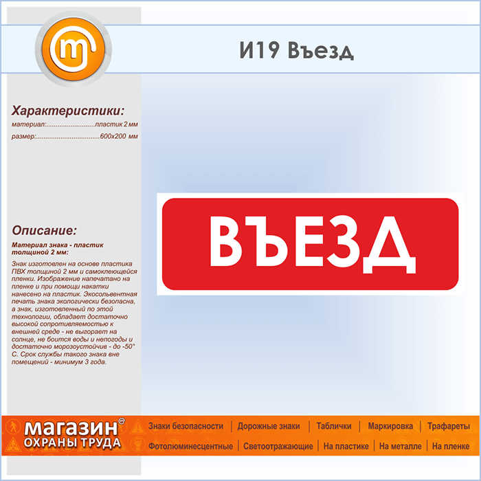 Знак «Въезд», И19 (пластик, 600х200 мм) в Кашире купить