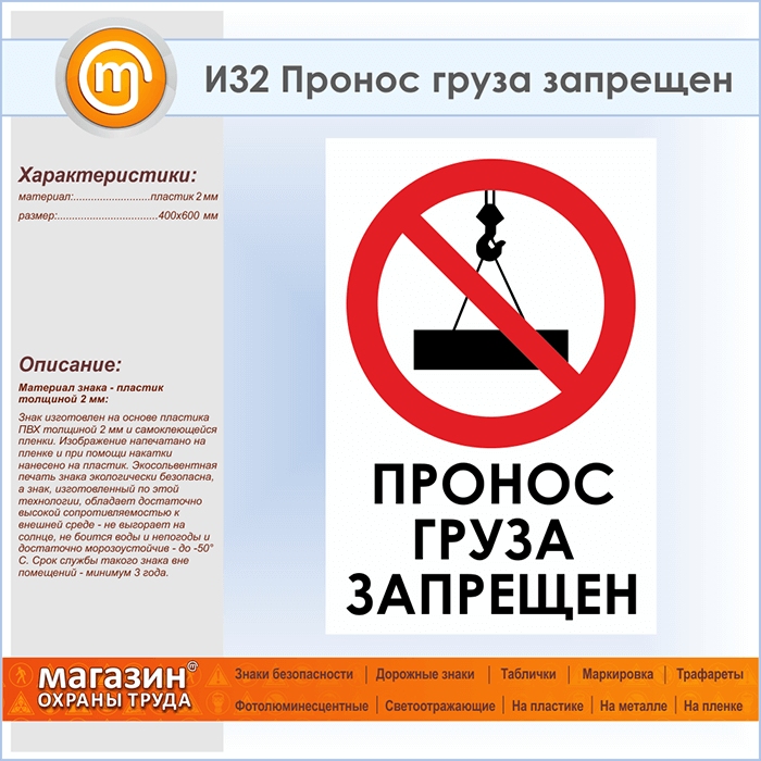 Знак «Пронос груза запрещен», И32 (пластик, 400х600 мм) в Кашире купить
