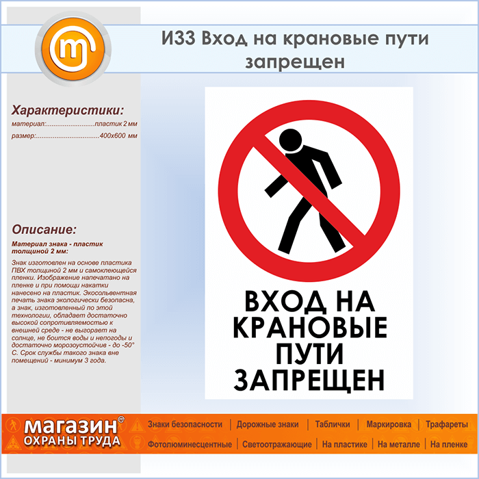 Знак «Вход на крановые пути запрещен», И33 (пластик, 400х600 мм) в Кашире купить