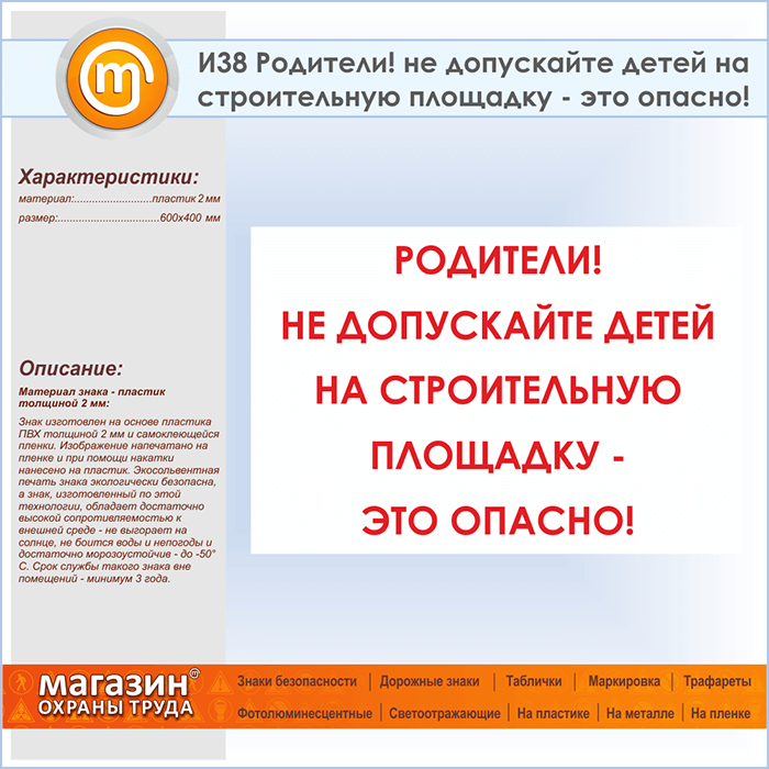 Знак «Родители! не допускайте детей на строительную площадку - это опасно!», И38 (пластик, 600х400 мм) в Кашире купить