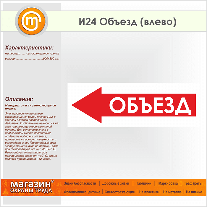 Знак «Объезд (влево)», И24 (пленка, 900х300 мм) в Кашире купить