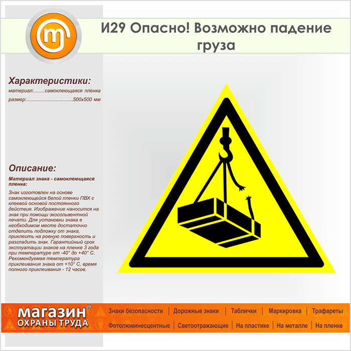 Знак «Опасно! Возможно падение груза», И29 (пленка, сторона 500 мм) в Кашире купить