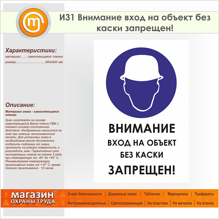 Знак «Внимание вход на объект без каски запрещен!», И31 (пленка, 600х900 мм) в Кашире купить