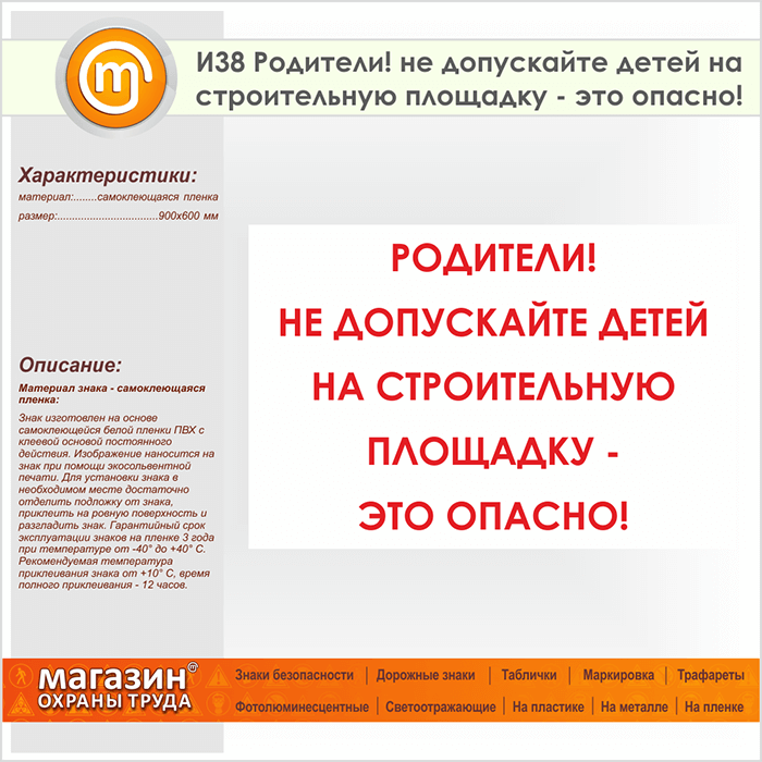 Знак «Родители! не допускайте детей на строительную площадку - это опасно!», И38 (пленка, 900х600 мм) в Кашире купить
