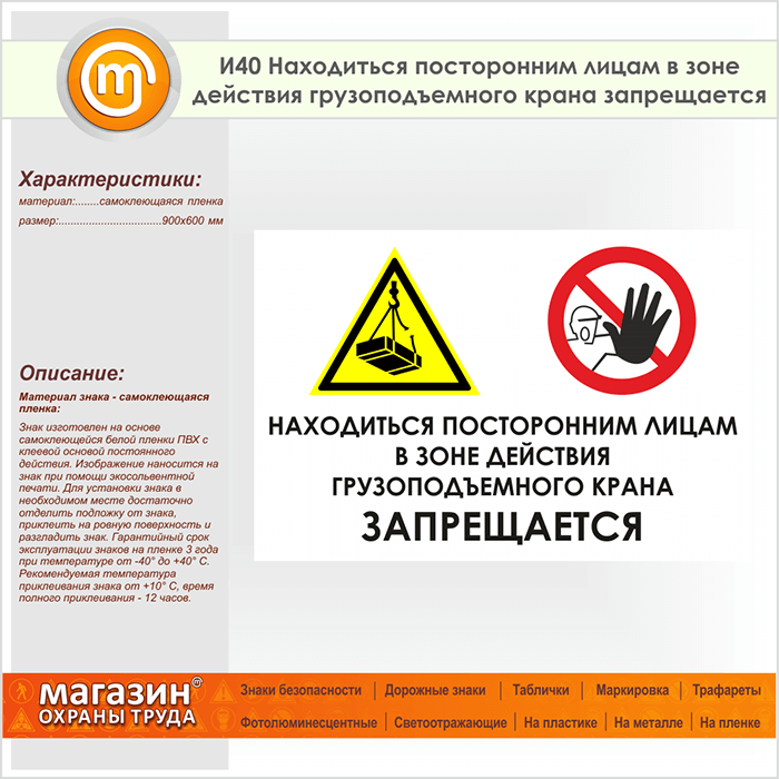 Знак «Находиться посторонним лицам в зоне действия грузоподъемного крана запрещается», И40 (пленка, 900х600 мм) в Кашире купить
