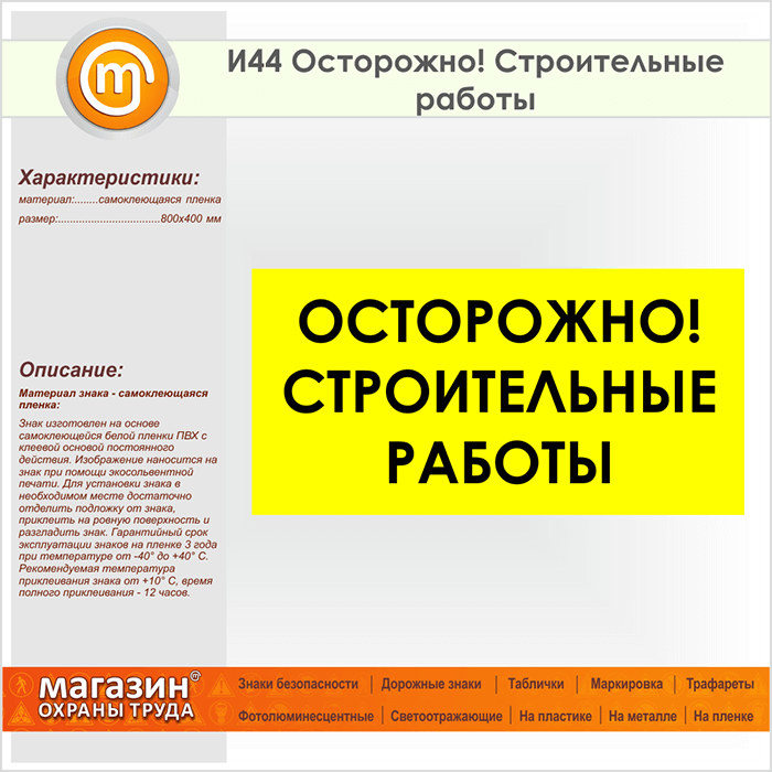 Знак «Осторожно! Строительные работы», И44 (пленка, 800х400 мм) в Кашире купить