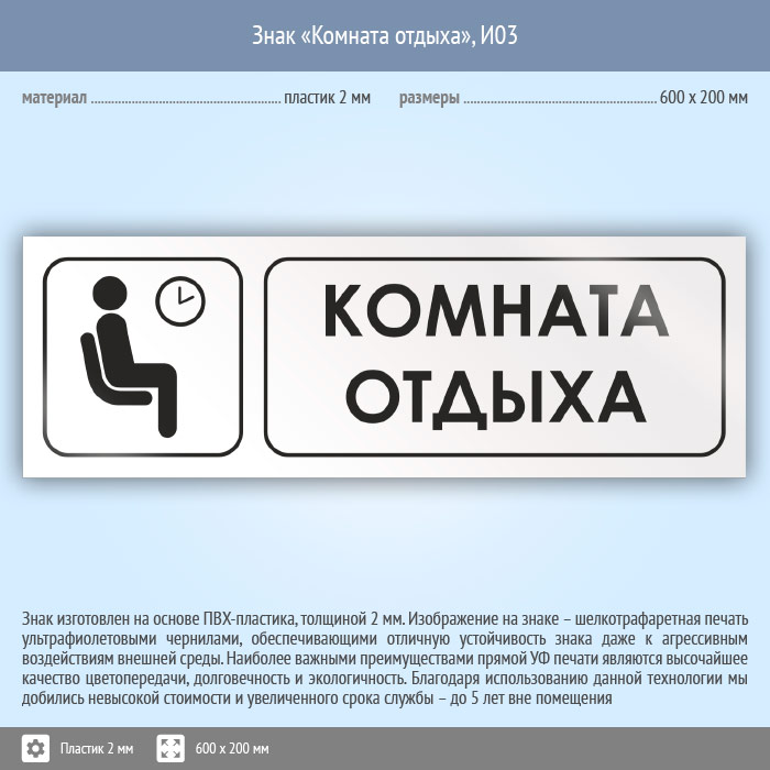 Знак «Комната отдыха», И03 (пластик, 600х200 мм) в Кашире купить