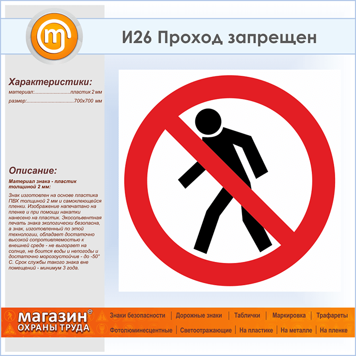 Знак «Проход запрещен», И26 (пластик, 700х700 мм) в Кашире купить