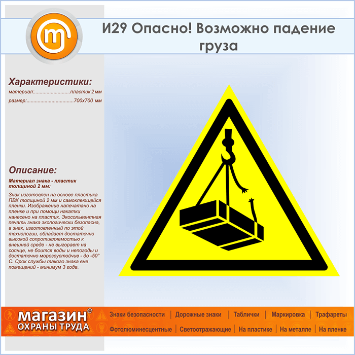 Знак «Опасно! Возможно падение груза», И29 (пластик, сторона 700 мм) в Кашире купить
