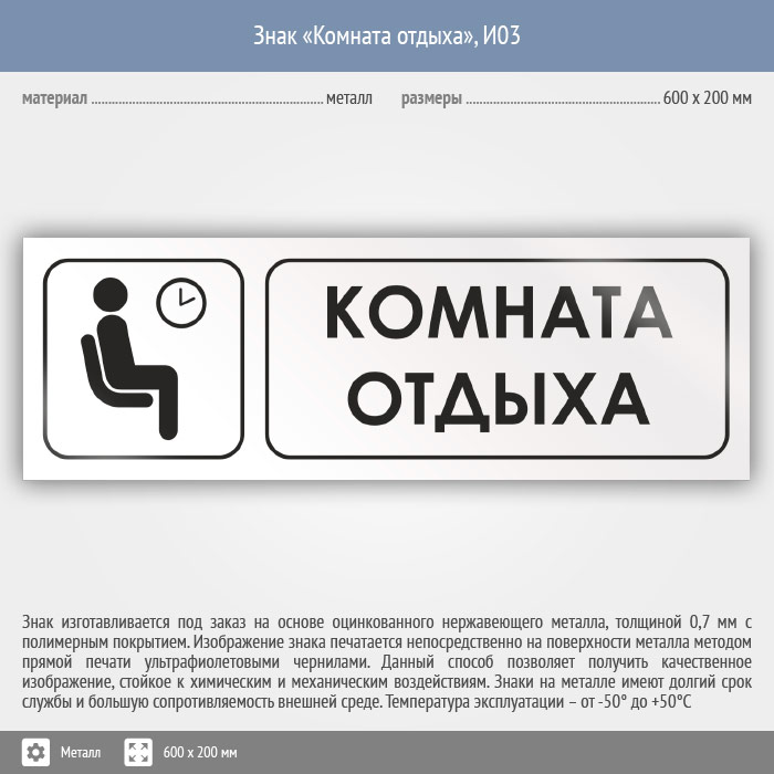 Знак «Комната отдыха», И03 (металл, 600х200 мм) в Кашире купить