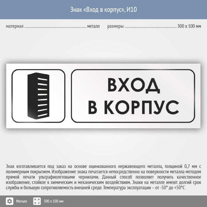 Знак «Вход в корпус», И10 (металл, 300х100 мм) в Кашире купить