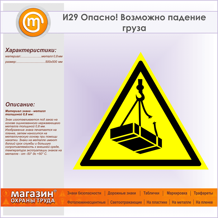 Знак «Опасно! Возможно падение груза», И29 (металл, сторона 500 мм) в Кашире купить