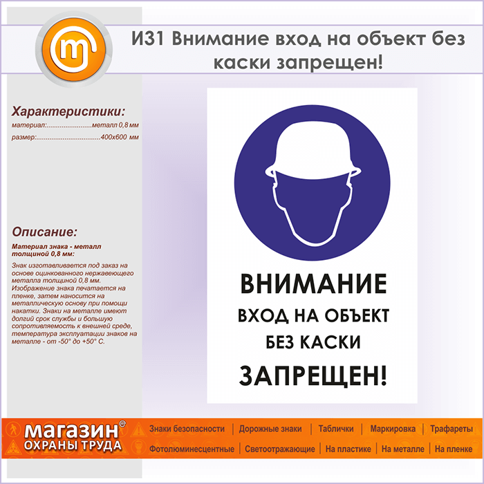 Знак «Внимание вход на объект без каски запрещен!», И31 (металл, 400х600 мм) в Кашире купить