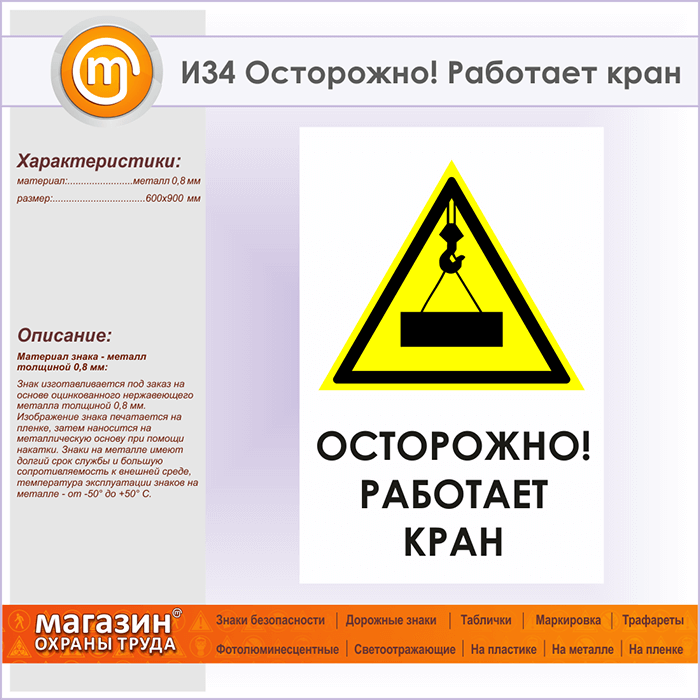 Знак «Осторожно! Работает кран», И34 (металл, 600х900 мм) в Кашире купить
